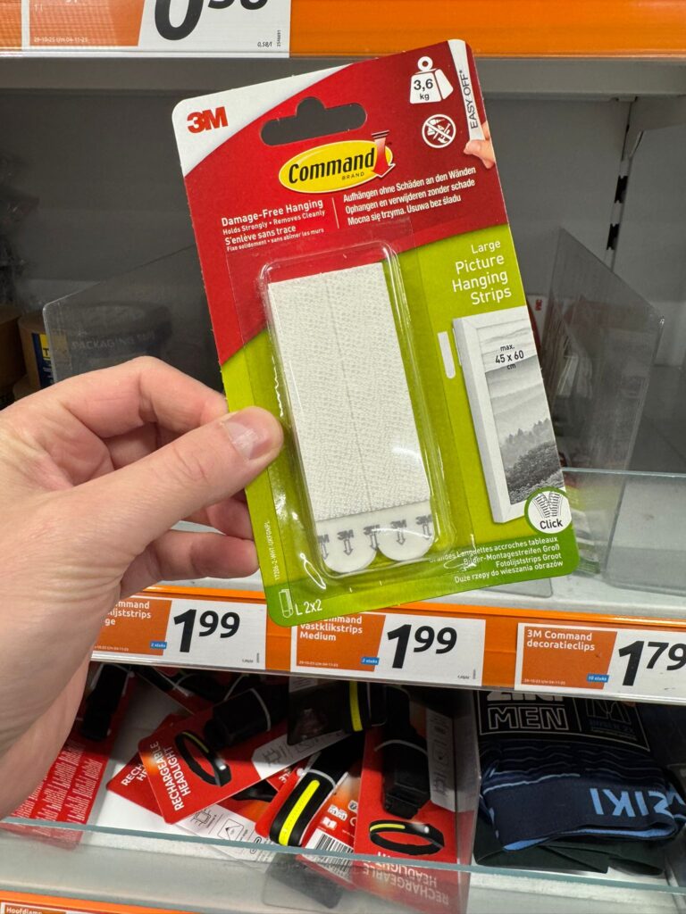 Je vindt deze superhandige 3M Command strips bij Action voor slechts €1,99. Loop even binnen en je kunt direct aan de slag. Geen boor, geen gedoe – wel een strakke muur vol moois.