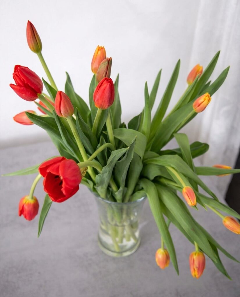 Een grappige eigenschap: tulpen maken ook in de vaas nog lengte. Daardoor kunnen ze onverwacht scheef trekken of je schikking uit balans brengen, zelfs als je alles netjes had geschikt.