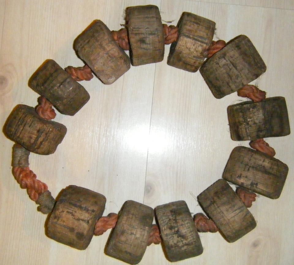 Op de afbeelding staat een koordje of bandje met een rij ovale, bruine blokjes – ze doen wel wat denken aan wijnkurken. Het oogt heel basic, bijna kneuterig. Is het een soort decoratie? Een zelfgemaakt sieraad? Of toch iets uit de keukenla?