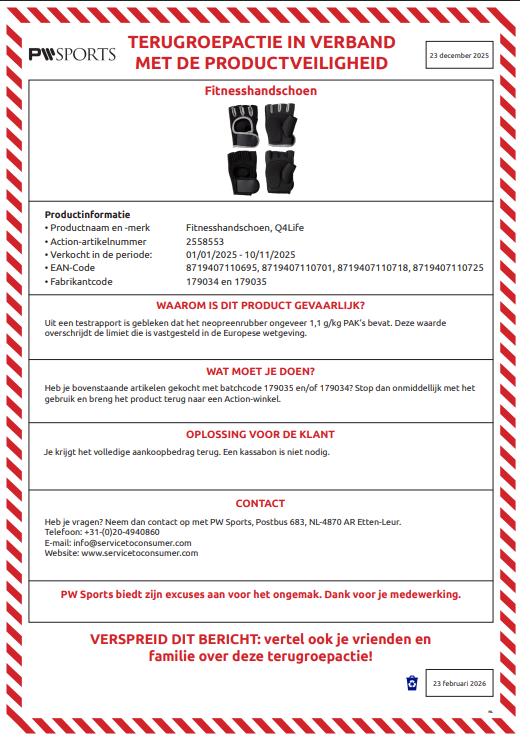Action roept een populair sportartikel terug dat in Nederlandse winkels heeft gelegen. Het gaat om fitnesshandschoenen van het merk Q4Life. Uit recent onderzoek blijkt dat dit product niet voldoet aan Europese veiligheidsregels. Daarom vraagt Action je dringend om de handschoenen niet meer te gebruiken en ze terug te brengen naar een Action-winkel.
