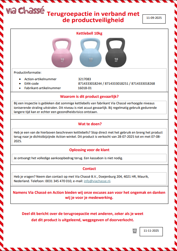 Bij een controle is vastgesteld dat sommige kettlebells van fabrikant Via Chassé te veel straling uitzenden. De kans op directe klachten is klein, maar als je de gewichten vaak en langdurig gebruikt, kan dat op termijn wel schadelijk zijn. Daarom adviseren Action en de producent om het product per direct uit de roulatie te halen en niet meer te gebruiken.