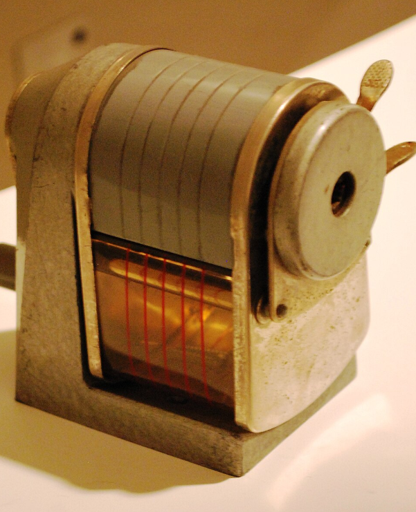 Er zat een draaimechanisme in. Je schoof het potlood in de opening, draaide aan de hendel en binnenin zorgden stalen mesjes voor een gelijkmatige slijp. Zo kreeg je een scherpe, nette punt zonder dat het potlood meteen brak. Simpel, krachtig en superduurzaam.