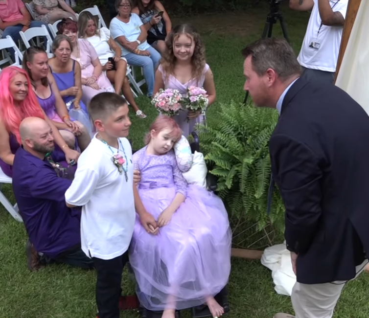 Op 29 juni rolde Emma, voortgeduwd door haar ouders, de feestlocatie binnen. Ze droeg een prachtige paarse jurk en straalde toen haar vader haar symbolisch naar het “altaar” bracht. Ze wisselden ringen, fluisterden geloften en DJ bezegelde alles met een kus.