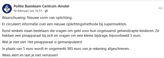 Volgens een bericht van basisteam Centrum-Amstel op Facebook zijn er recent meerdere situaties geweest waarin het “kleine” donatiebedrag ongemerkt veranderde in bijna vier cijfers. Hun advies: blijf scherp, laat je niet opjagen en controleer altijd wat je bevestigt voordat je je pincode intoetst of contactloos afrondt.