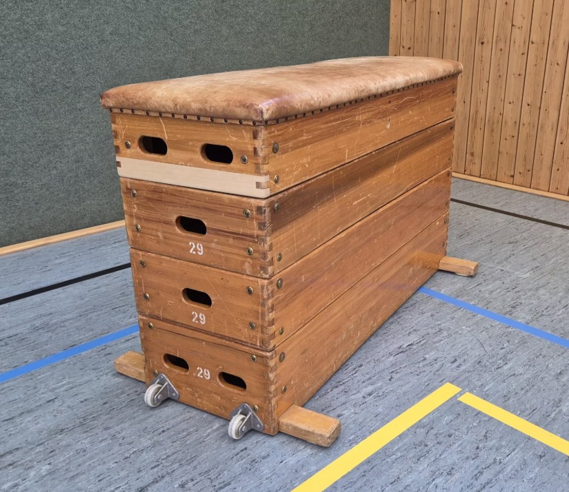Je hebt een ouderwetse, wat verkleurde foto voor je, gemaakt in een sportzaal. Achterin hangen houten wandrekken en ligt er een mat op de grond. In het midden staat iets vreemds: bruin, met leer bekleed en op houten poten. Je zou kunnen denken aan een meubel, een oude kist of misschien een kunstwerk.
