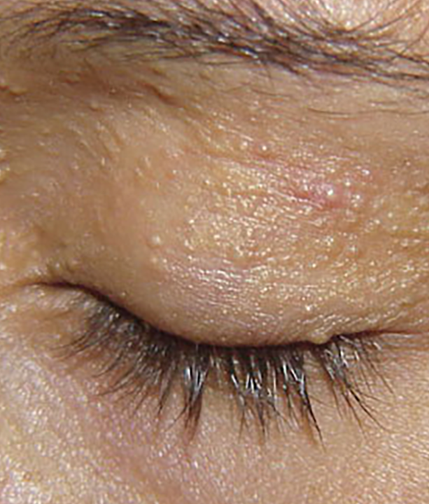 Het zijn ronde bultjes van ongeveer 0,5 tot 2 millimeter. Ze zijn wit of gelig van kleur, voelen hard aan, raken niet ontstoken en doen geen pijn. Zonder behandeling kunnen ze lang blijven zitten.
