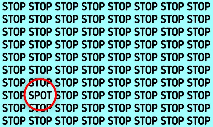 Het geheim van deze puzzel? Het woord stop is weergegeven als spot. Dit subtiele verschil wordt makkelijk over het hoofd gezien tussen de juiste woorden.