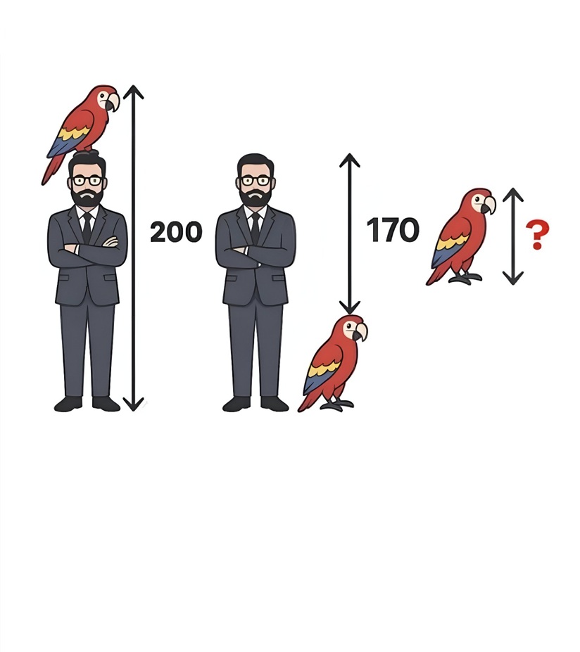 Kijk eerst naar de eerste situatie: samen zijn de man en de papegaai boven op zijn hoofd 200 hoog. In de tweede situatie is de man 170 hoger dan de papegaai wanneer die op de grond staat. Met die twee feiten heb je een klein stel vergelijkingen te pakken.