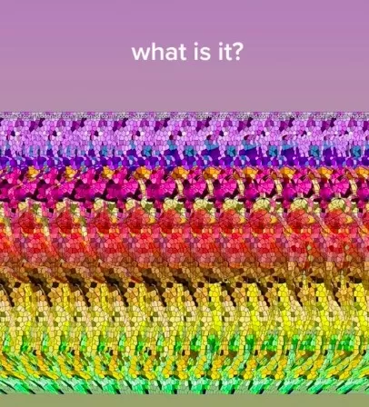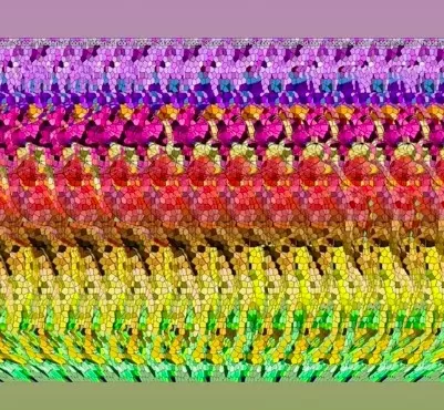 Wat je hier ziet is een autostereogram, een 2D-afbeelding vol herhalende elementen, waarin een 3D-figuur verstopt zit. Op het eerste gezicht herkent ons brein alleen die oppervlakkige 2D-elementen, zonder diepte te zien. Het geheel lijkt zich te richten op de rijke kleuren, terwijl de diepte onopgemerkt blijft.