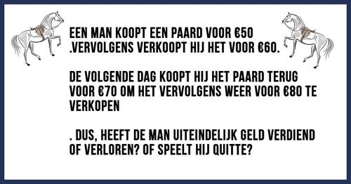 Kun je het antwoord vinden? Probeer te bedenken hoe snel je de oplossing kunt vinden. Heb je al een idee? Controleer goed of je redenering klopt. Een man koopt een paard voor €50 en verkoopt het voor €60. Daarna koopt hij het terug voor €70 en verkoopt het weer voor €80. Bij deze transacties, heeft de man winst gemaakt of verlies geleden, of staat hij quitte?
