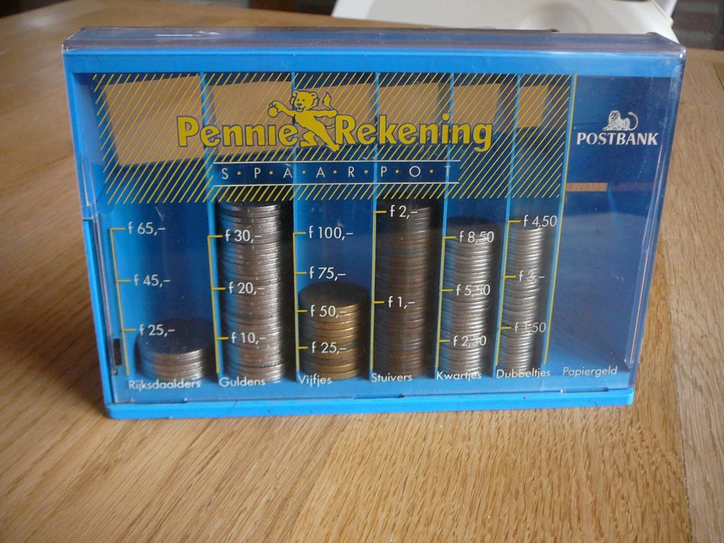Antwoord: Het is een spaarpot van de Postbank speciaal voor pennie rekeningen – dit was een ingenieuze, mechanische spaarpot die kinderen kregen als ze een pennie rekening openden bij de bank. In de vakjes kon je de muntjes precies kwijt, zo wist je meteen hoeveel je al verzameld had. Het was zowel een leermiddel als een nostalgisch object dat generaties geholpen heeft te begrijpen hoe je het beste kunt sparen.