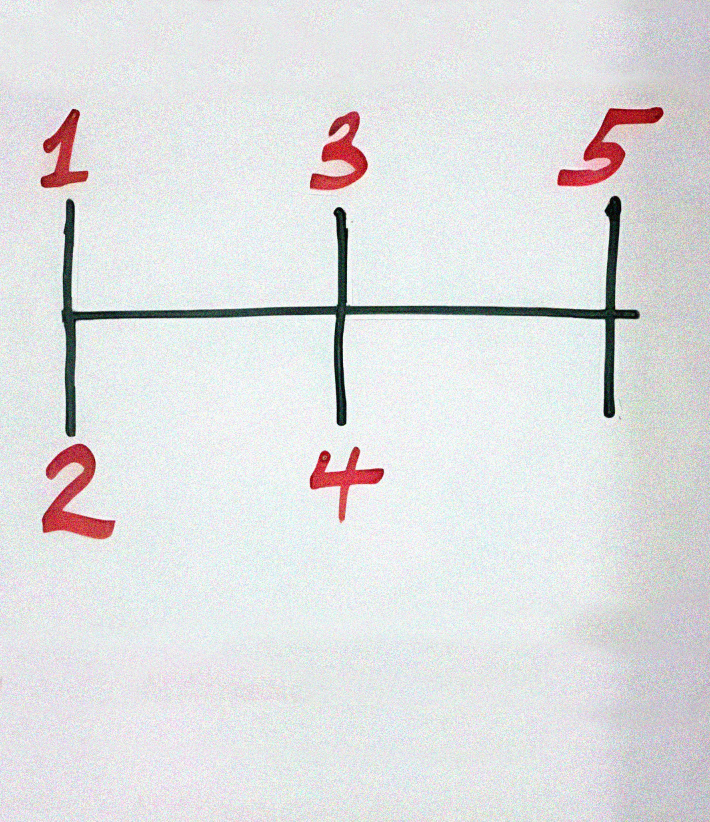 Veel raadsels lijken simpel, maar worden pas echt leuk zodra je doorhebt waar het plaatje naar verwijst. In eerste instantie zie je alleen wat lijnen met nummers eromheen: links 1 en 2, in het midden 3 en 4, en rechtsboven een 5. Als je ooit in een handgeschakelde auto hebt gereden, herken je meteen dat dit het schakelschema van een klassieke versnellingsbak is.