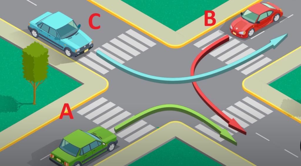 In het eerder genoemde voorbeeld zouden de voertuigen in de volgorde A, C en dan B moeten rijden. Volgens de Nederlandse verkeersregels heeft verkeer dat rechtdoor gaat op dezelfde weg voorrang op verkeer dat afslaat. Had je het goed geraden?