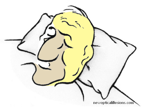 De slapende vrouw staat echt in het beeld. Haar gezicht valt minder op, maar als je goed kijkt, zie je dat de neus van de man eigenlijk de linkerwang en kin van de slapende vrouw vormt.